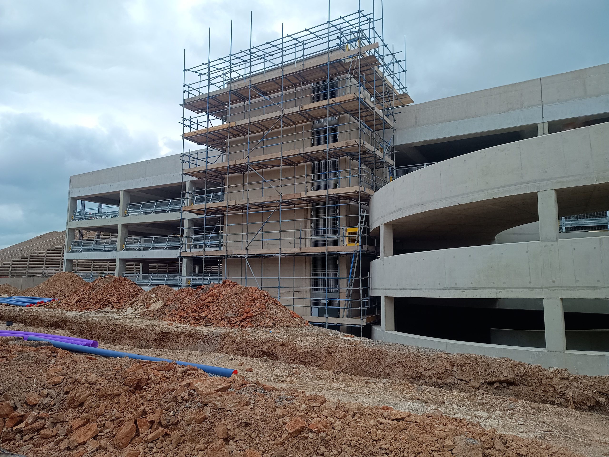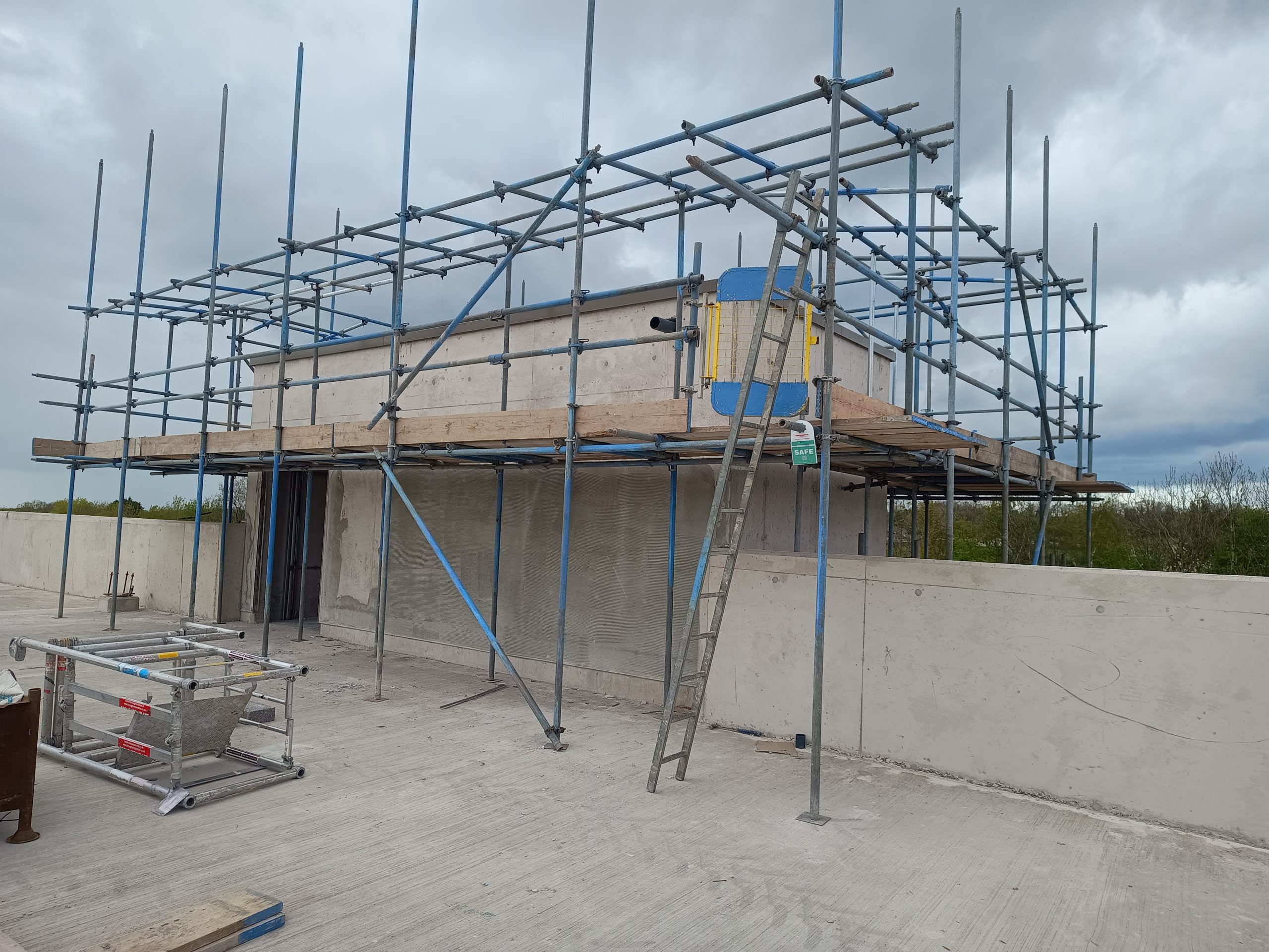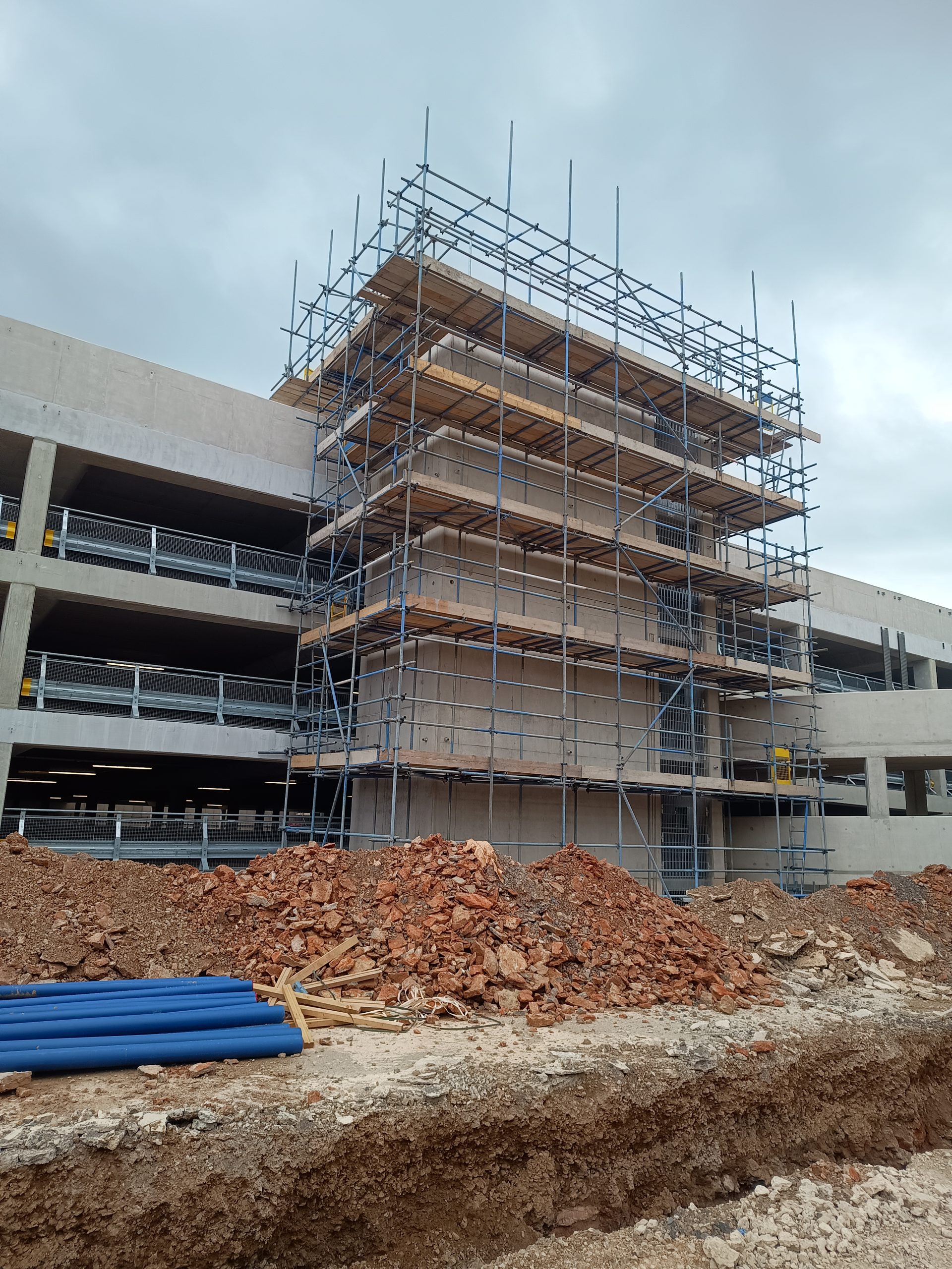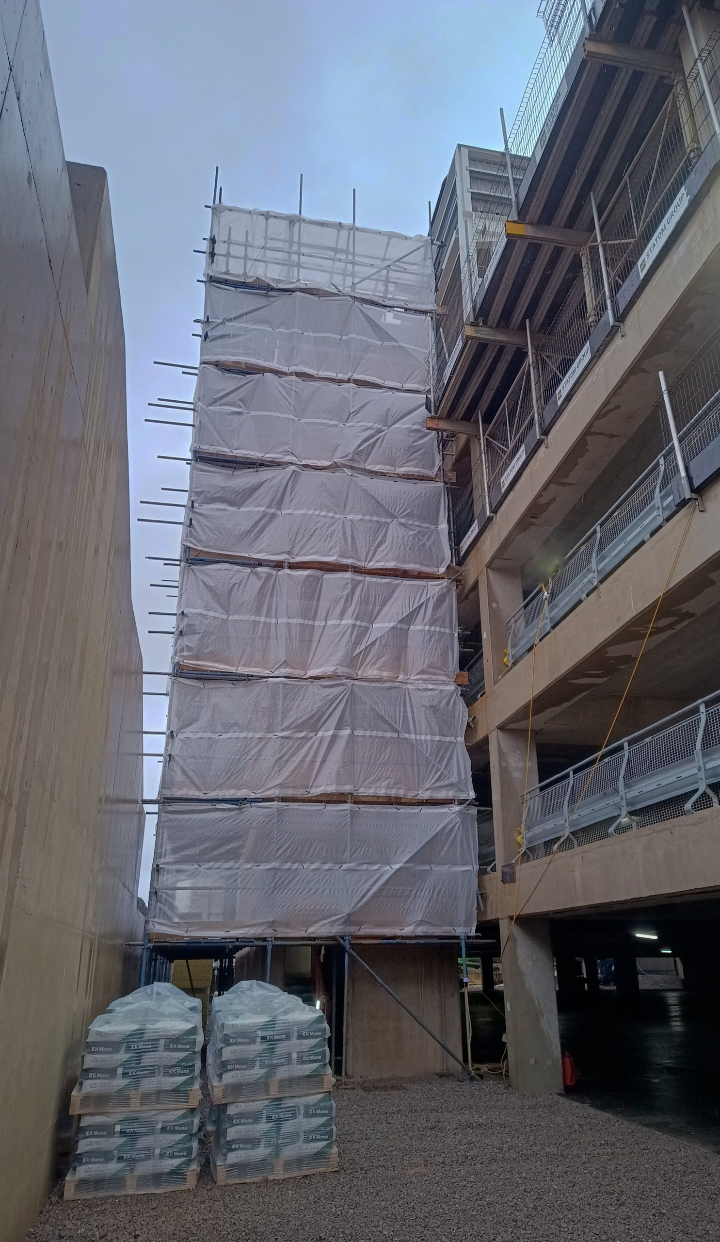 Access scaffolding and Weather proofing to the perimeter of pre-cast concrete stair-cores for finishes.